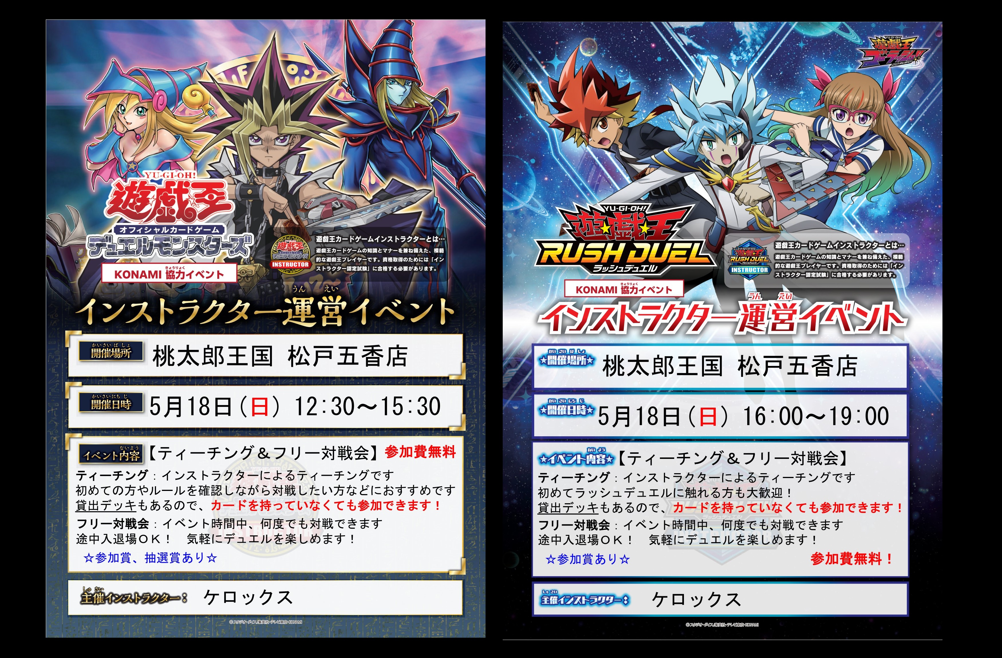 5/18(日)12:30より、桃太郎王国松戸五香店 デュエルスペースにて、ケロックス様主催の【 インストラクター運営イベント 】を開催いたします!